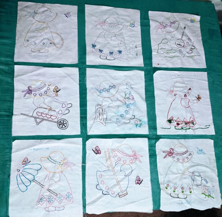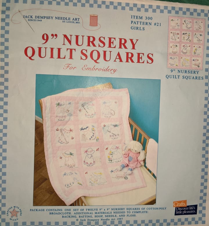 I had a Jack Dempsey “Little Girl” Quilt Block Kit in my embroidery box waiting for such a time as this and when I felt they had practiced sufficiently, I got it out.