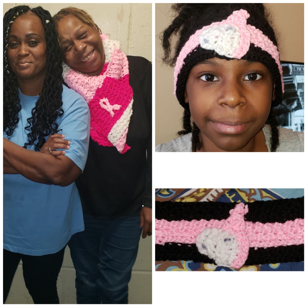 My aunt (wearing the scarf) and her friend are very close. I think her friend loves her just as much as I do. But my aunt has gone through some rough times in her life and one of them is the reason for the scarf she is proudly wearing and had to show off to her friend. She is a Breast Cancer Survivor and I wanted give her something from my heart to show her I will always be there to give her my love and support. Almost every year I go on the Cancer walk in her honor, always wishing she could be there with me. But her health has never allowed her to go along with me. So I decided I wanted to give her something that she could wear while she watched the walk from home. I used light pink, fuchsia and white and I event included the Pink "ribbon". When I gave it to her, and saw her happy tears made me so proud, and I cried too.
