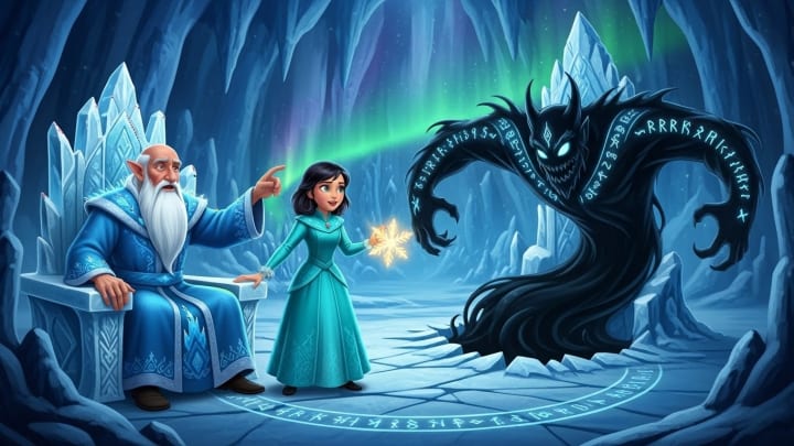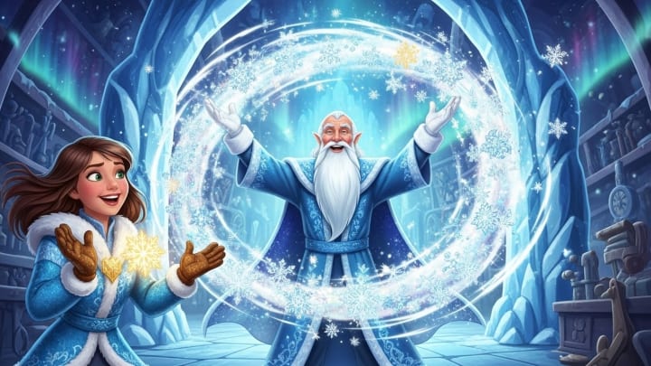 The tear did not freeze. It trembled, and then a pale blue-silver spark leaped from its center. A small, fragile, dancing flame came to life. It emitted no heat, but a soft light and a profound sense of peace and joy. It was the Flame of Eternal Winter. The black ice crackled back, and the malevolent shadow let out a howl of frustration that died away in the depths, sealed once more. In the palace above, a great shiver of life ran through the walls. Aeolus straightened, and a radiant smile lit his ancient face. He held out his hands, and in a sparkling whirlwind, thousands, millions of perfect, intricate snowflakes sprang from his fingers, filling the workshop with their silent ballet. They were dazzling white, and each one carried within its core a tiny reflection of the bluish flame.