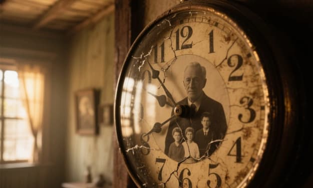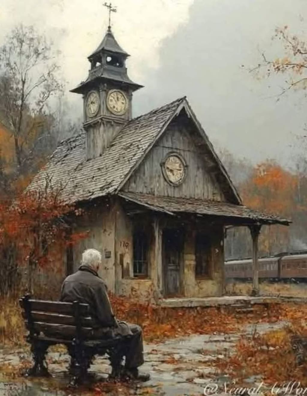 The cold autumn wind swept through the empty countryside, sending dry leaves tumbling across the cracked stone platform of a long-forgotten train station. The wooden bench where Edward sat creaked under his frail weight, its weathered slats worn smooth by years of waiting. He gazed up at the clock tower perched atop the station’s roof — its face cracked, hands frozen in different times — a silent testament to the years that had passed here without mercy.