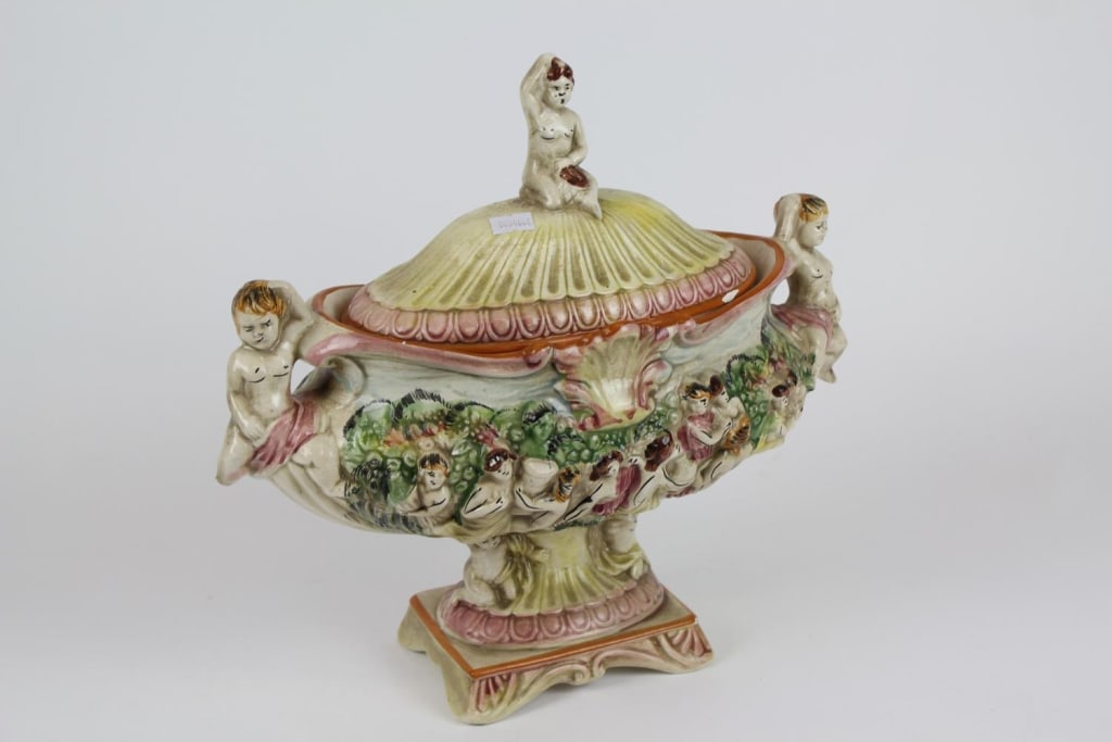 In the living room was a large glass curio cabinet with three shelves. On the bottom shelf sat an antique porcelain tureen bowl for soup with a cover and matching spatula. The ornate bowl was decorated with gold-leaf designs and had a cupid standing on each side. I opened the curio and pulled out the bowl and sat down on the carpet. Inside of the bowl, there was a layer of Christmas wrap.