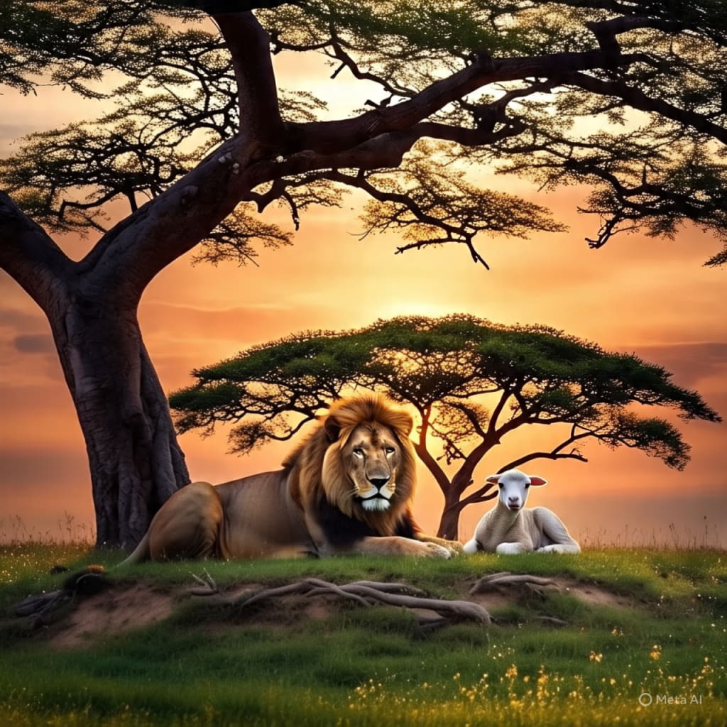 Far away in a quiet meadow, nestled beneath the arms of an old acacia tree, lived a lamb named Luma. She was small and soft, with fleece as white as clouds and eyes full of wonder. Luma had never wandered far from her flock, and had only heard stories of Baran—the lion with teeth like knives and eyes like fire.