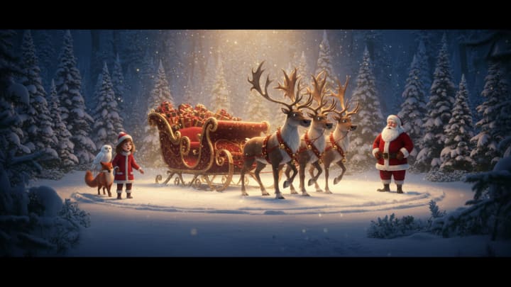 After a long while, they arrived in a clearing bathed in golden light. And there, in the middle of the trees, stood the most extraordinary of sights: an immense red and gold sleigh, pulled by three magnificent reindeer pawing with impatience. And beside the sleigh, a figure that all the children of the world would recognize among thousands.
