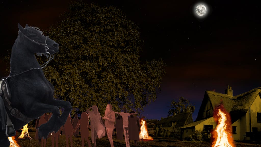 At somewhat of a gallop now, he enters the village square. He notices many villagers around a single tree opposite a large Inn type of building. The Bonfires were in a circle the villagers dancing around the tree. One villager dashed away to the large building as Liam pulled up his horse with it rearing up on his hind legs then came to a complete stop. He looked around atop his steed to assess the area. He noticed two people coming out of the building. One was a young boy, the other a beautiful young lady with her arms out and white garments draped across both of her arms.