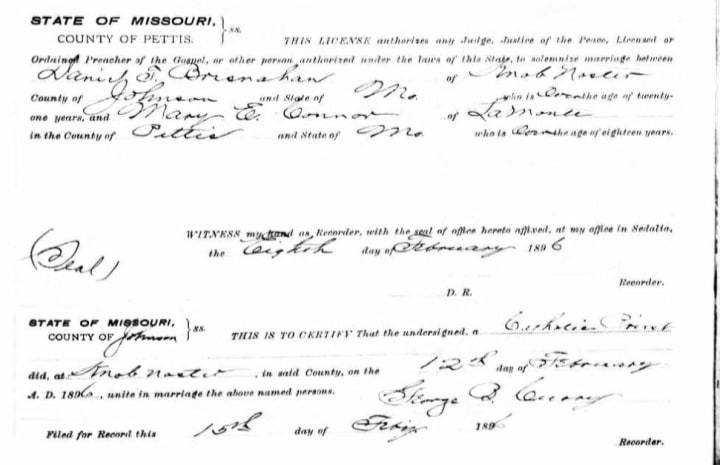 Daniel T Brosnahan was b0rn on April 2 1873 in Missouri to Timothy Brosnahan, an Irish immigrant, and Mary Reidy. Mary E Connor was born around 1877 in Missouri to parents whose names are not known. Daniel and Mary married on February 12 1896 in Knob Noster, Missouri when Daniel was 22 and Mary was 19.