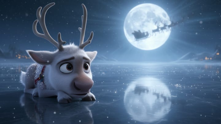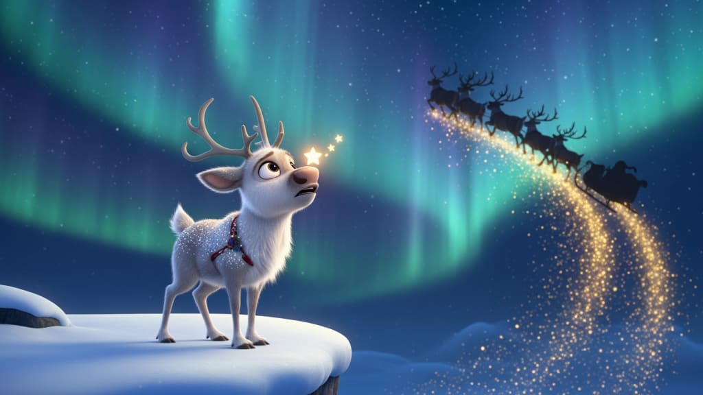Among them, a young reindeer named Frost dreamed more than anything. His coat was an immaculate white, dotted with silver reflections that sparkled at the slightest gleam, and his eyes were two vast pools of winter sky, full of curiosity and hope. Since he was little, he watched, heart pounding, the great reindeer training. He listened to the epic stories of journeys around the world, of the thrill of cutting through clouds, of the joy of seeing children's eyes light up below. His greatest desire was to join the team and hold the reins of the great magical sleigh, alongside Rudolph and his companions.