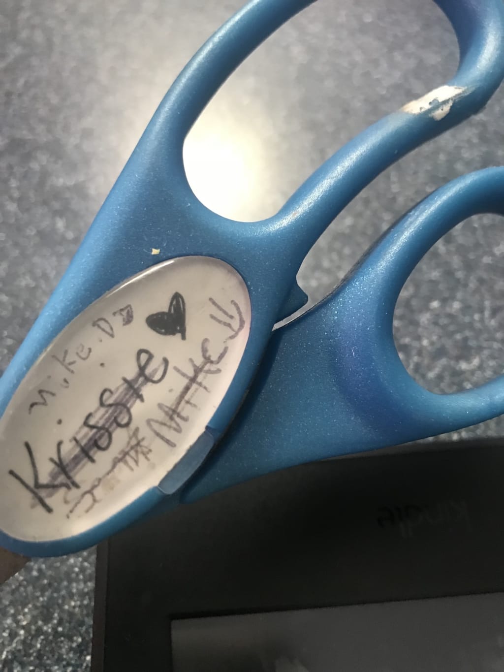 Years later, while visiting, those same scissors were in the junk drawer. I was scrapbooking even less then. I didn’t have time to document the life I was living; it was moving too fast. My brother was older, getting ready to head off to the Air Force. His name had been crossed out, replaced by my niece’s—Sammie—no doubt scribbled it on after she needed them for some craft project.