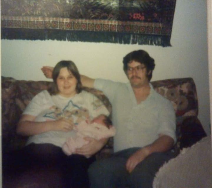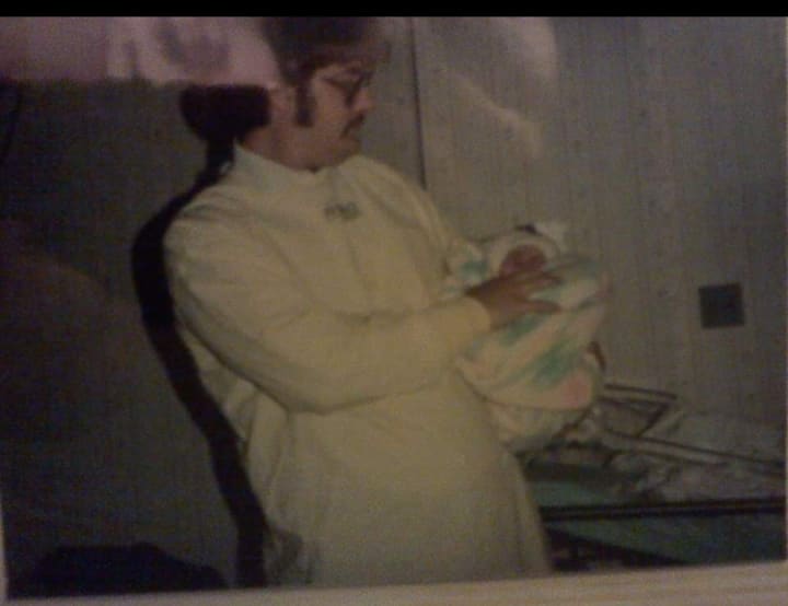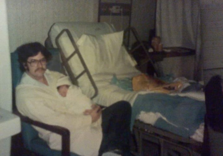 This was my dad's first baby and his first time taking my mom to the hospital. He was unsure what to expect. What was funny was my dad almost made my mom have her first baby in the garage of their apartment.