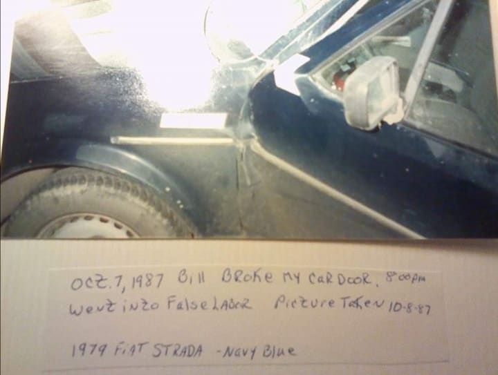 While my mom was in pain and trying to breathe through the contractions. My dad was finally about in the car and starting it up. My aunt had got out of the car and went back into the house, and my dad was to shut the back door before pulling out the garage, but he forgets to shut the door and began to back out the garage.