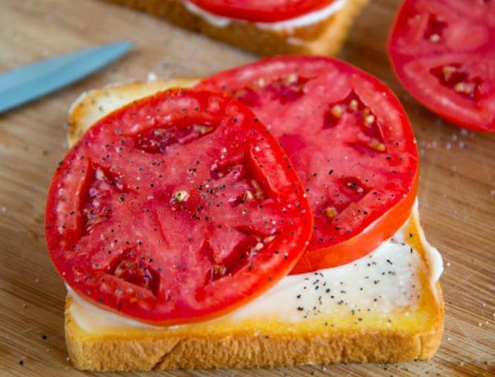 Juices ran through her fingers as she sliced the bright red fruit and placed thick slabs on the prepared bread. We each salted and peppered the lush sandwiches to our own preference.