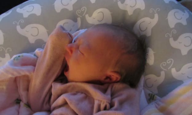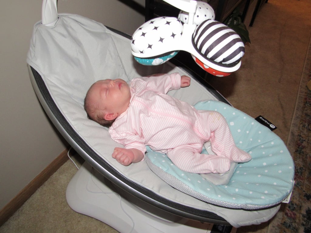 About eight feet away, she lay quiet in the Mama-Roo. Picture a kangaroo, but electric with no head or genitals, and then get that image out of your head; it looks nothing like that. It’s just another plastic piece of shit that rocks baby to sleep whilst playing the soothing sounds of rain, a heartbeat, Steve Winwood, etc. About thirty percent of the time, she likes it, or it appears to soothe her. For the remainder, she fights and cries for parent contact. She loves to be walked around, and she falls asleep quickly when Mommy and Daddy curl her up. Just since I started this paragraph, I have removed her from the device which is still swingin’ away, and she is next to me in her Boppy—a soft, C-shaped pillow that sits her up at an angle (I don’t know angle numbers, so I’ll guess 450 degrees) and supports her head and allows for no flipping over onto her stomach without guidance.