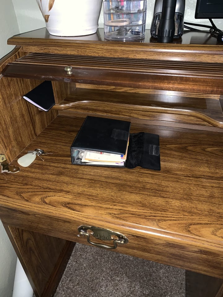 Closing the door, I stopped to assess where to begin. The file cabinet and roll top desk were in her den, so I meandered down the hallway to the door. Opening it slowly, I paused before proceeding. The desk was covered in dust so I grabbed a rag, sprayed it with polish, and made a quick swipe over the top. When I rolled up the cover of the desk, there were exactly three things inside. A set of house keys, a banking checkbook, and a small black notebook.