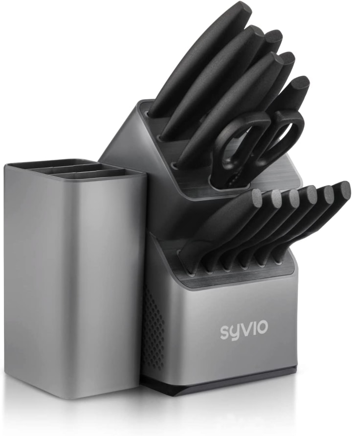 Knife Set: A good knife set is essential for food preparation. Look for a set that includes a variety of knives such as a chef's knife, paring knife, bread knife, and utility knife. The knives should have sharp, stainless steel blades and comfortable handles for easy and safe use.