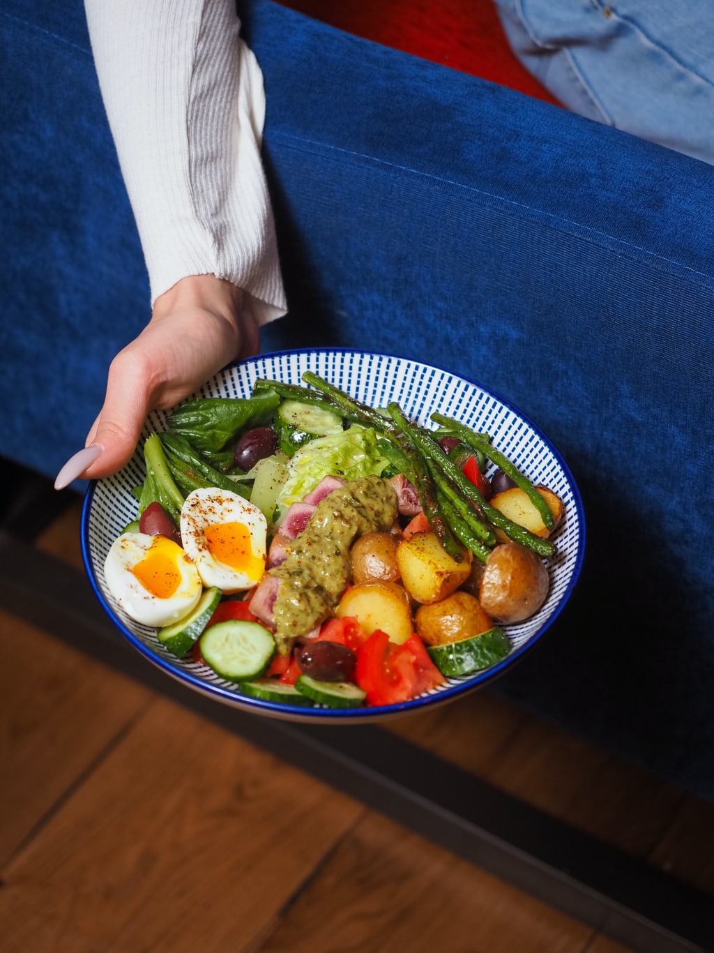 Lunch: Cobb salad with bacon, avocado, and blue cheese