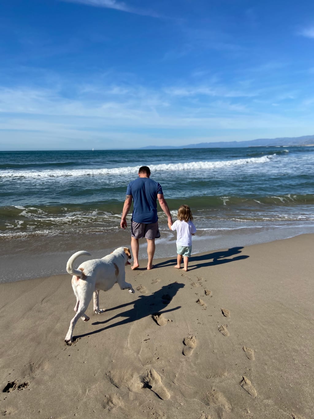 The sun was warm, and the wind whipped up just enough to make it difficult to hear the ocean waves cresting onto the sandy shoreline. All though it was winter in Southern California, it still was a beautiful day to be at the beach. Only a few souls littered the tan strip of sand that was situated between a row of magnificent homes and the sapphire Pacific Ocean. A man fishing from the shore could faintly be seen as What looked like a young family entered the beach along a walkway that was guarded by a high wall covered in beautiful murals of random street art and graffiti. When the man and woman verified the coast was clear they untethered their white Labrador retriever and released hands with the young boy encouraging him to follow the dog down to the small breaking waves in the ocean.