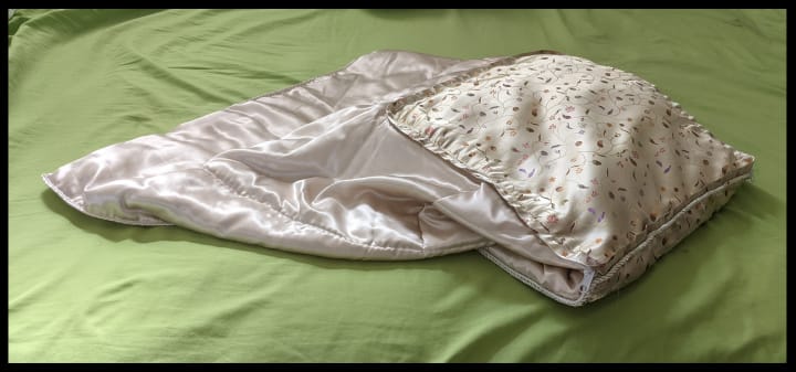 In the gift shop there were so many marvels! But the one thing I had to have was this silken quilt that zipped into a pillow. It was beautiful. The silk was so soft. The idea of a foldable blanket was really ingenious and convenient. Lara bought one too.