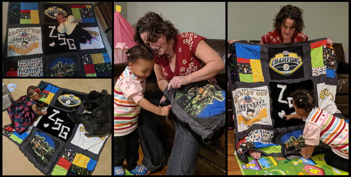 I had four shirts with Pittsburgh themes that I wanted to use for Zohara’s quilt. A Steelers shirt from me, a Penguins shirt from my brother (her father), and a Pirates shirt from my father (her grandfather).