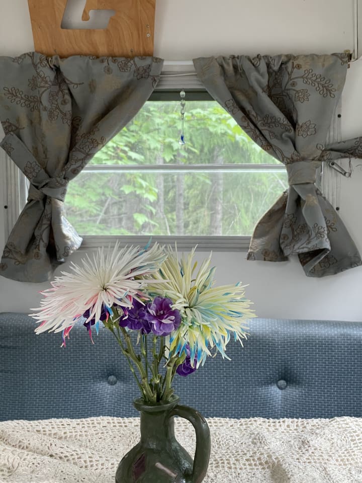 I am replacing them with much thicker blue with a bronze floral designed upholstery fabric which I managed to score a few meters under ten dollars at the local thrift store. By no means my all-time favourite pick, but it was a steal of a deal and, of course, does not scream orange at me. All in all, I am winning! Not that this flower power fabric will end up in the garbage. As someone who takes small steps to lessen my environmental footprint, these curtains will turn into doll clothing or gift wrapping. I have only completed one set of curtains with matching ties for the first window, yet it has been a gratifying project thus far.