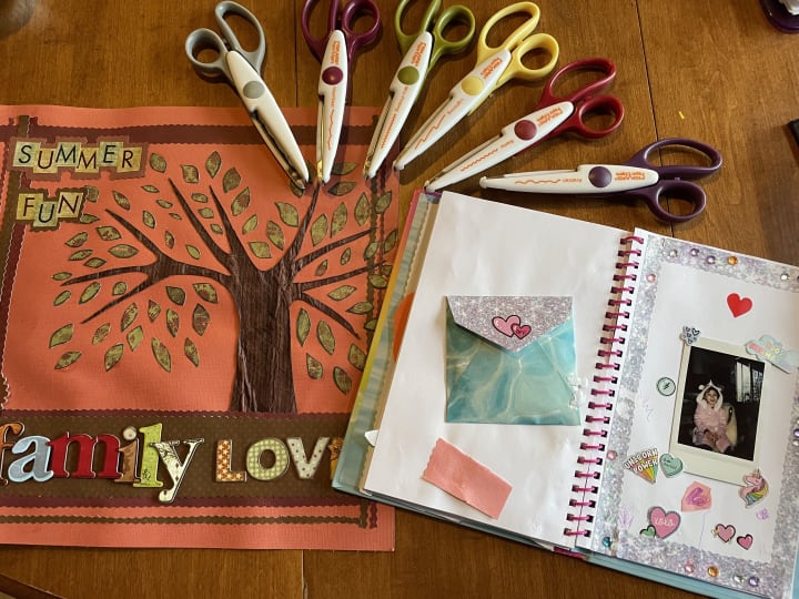 Scrapbooking edgers with different patterns. "Lighting," "Stamp," "Arabian," "Heartbeat," "Mini-Pinking," and "Victorian." Resembling an array of Zig-zag, wave, curve and lace cuts. Scrapbooking in itself is a time-consuming and strategic craft that one may find frustrating but oddly satisfying. I create them as gifts to my family from cover to cover, which the bodies I make out of hand-stamped and stained leather. All of these scissors have a unique purpose when creating borders for pictures or embellishments. Of course my daughter fallowes in my foot-steps and has found a love for scrapbooking her Polaroid pictures alongside me.
