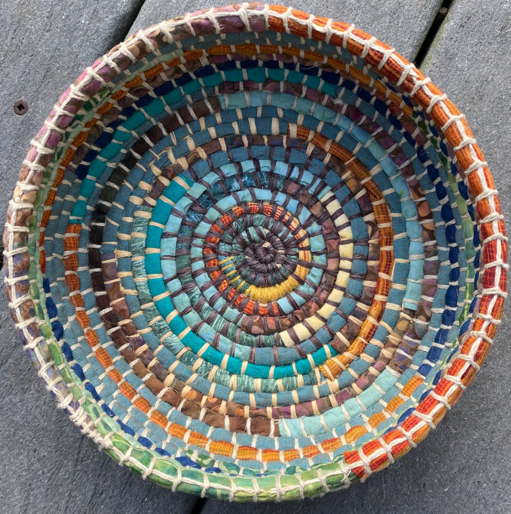 These baskets are made of discarded things—coils of old rope from a hammock that was becoming too weathered to use, packing paper cut up and twisted from all the deliveries we receive, seams cut from old jeans, adorable dresses my daughter has outgrown, favorite t-shirts, and beautiful blouses that have gone out of style. The fabric is cut into small strips and wrapped around a core of rope and paper, then tightly tied with raffia or string. I use the same technique I learned from those native weavers who taught me to make traditional coil baskets. Unlike them, I am not very disciplined in my process. Not to disrespect their beautiful traditions, but freeing up my expectations feels right at this time. When I start, I have no idea how big the basket will be or what colors I will use. I just start, dig around in my scraps for what I like, and I finish when I’m ready to move on. As I work, the memories from the fabric flood over me and by the time I’m done, I’m ready to let it go. Nearly all the baskets I’ve made I’ve given away, each one a special gift to someone I love. Little do they know what secrets each basket holds, and that makes me happy.