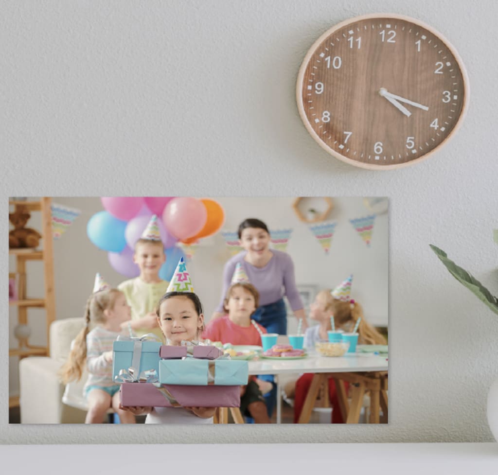 💡 Pro tip: Choose the 4x6 or 5x7 inch sizes — perfect for shelves or work desks. Add a themed border with balloons, bears, or stars to make it more festive.