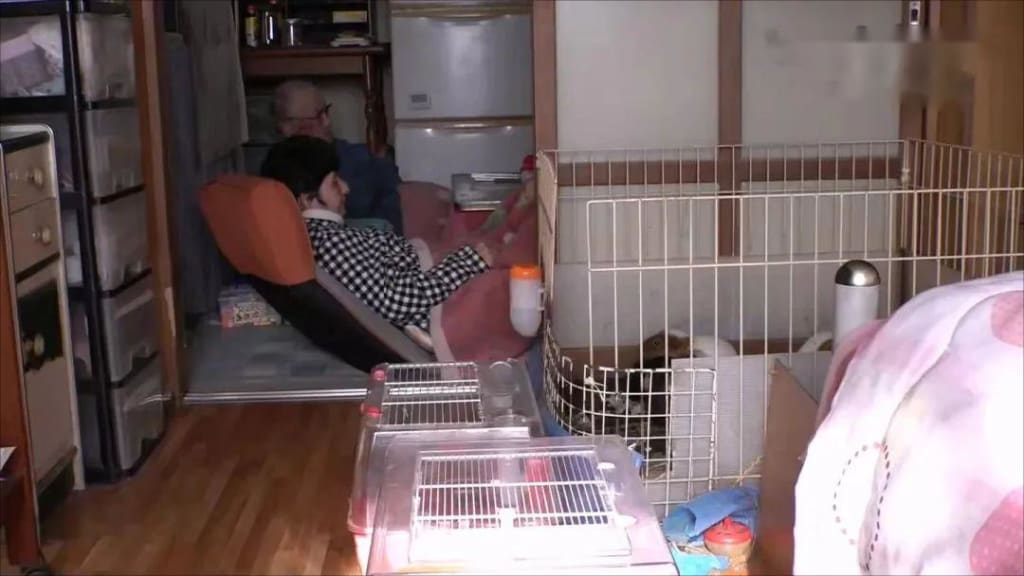 It's difficult to believe Keiko, 52, has lived in this house for 35 years. She rarely leaves the house and doesn't go to work. Daily activities consist of eating, sleeping, watching TV, using a phone, and occasionally teasing a guinea pig.