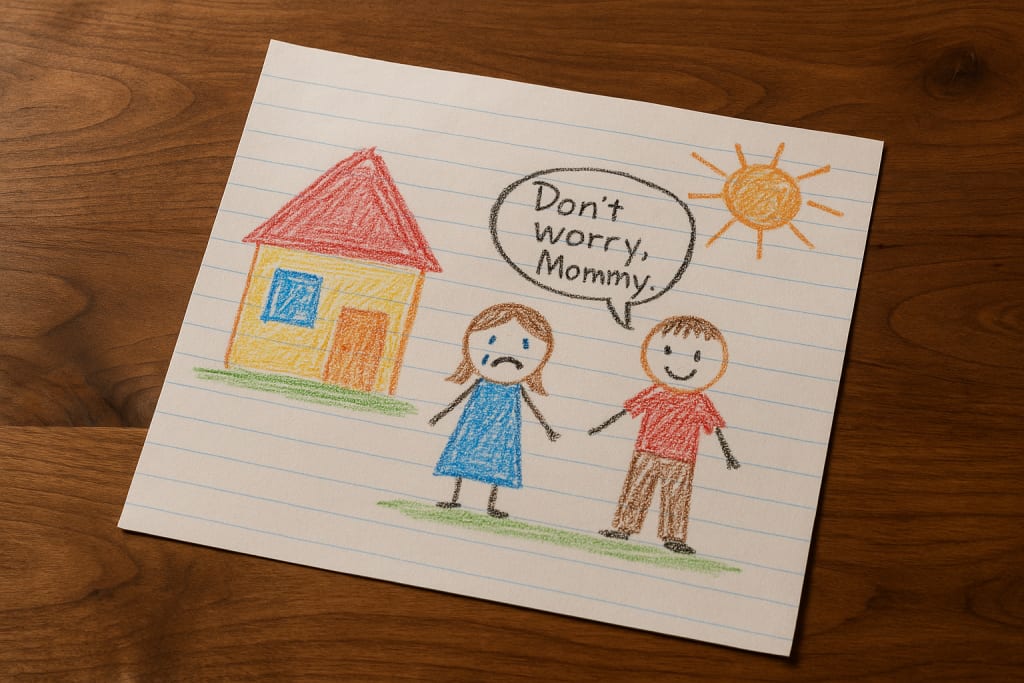 It was a drawing. Crayons, bold lines, orange sun in the corner. A house. Two stick figures. One had tears drawn under its eyes. The other had a word bubble that said, “Don’t worry, Mommy.”