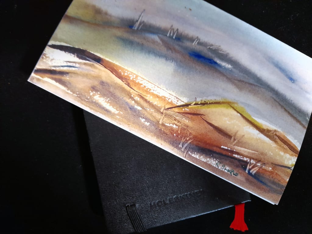 Curtis stretched and looked around as he swallowed some water and noticed someone else had set up not far from him with an easel and what looked like watercolors. Curtis focused on the watercolor paper pinned to the easel with clothespins, and his jaw dropped. The artist, an older man, was drawing the same lighthouse he was, but the lines! A fine black pen line had swooped across the paper first, somehow capturing the scene in only a few strokes - this curve or squiggle somehow painting the exact lines of form - he didn’t know how to describe it. The artist was now washing those lines with color, capturing the scene’s light and feeling, despite few details. Curtis looked back at his own sketch with disappointment, seeing how little what he’d drawn evoked the view in front of him. Frustrated, Curtis began to rip the page from the book but then stopped, knowing there was a chance to change it once he brought it home to the digital drawing tablet.