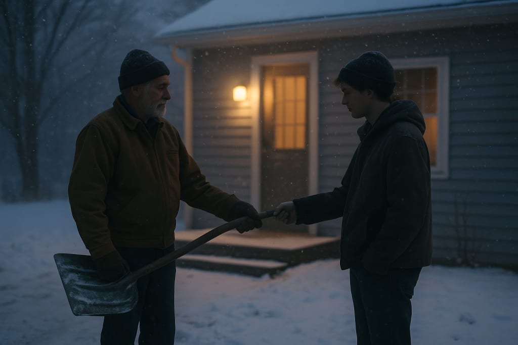 One winter night, I was standing beside him on the driveway. It had snowed the night before and we were clearing it out in the early dark. He handed me the heavier shovel, took the flimsy one without a word. No "thanks," no "you take a break" — just a quiet shift in weight. I understood. He was saying, Let me take this one. I can still carry it.