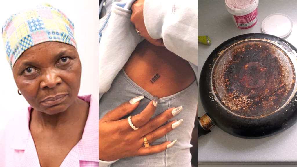 The next thing I knew, my mother grabbed the frying pan from the stove and struck me. Right under my breast where the tattoo had been. The hot oil and beef scattered all over the floor, some of the oil also burnt my leg.