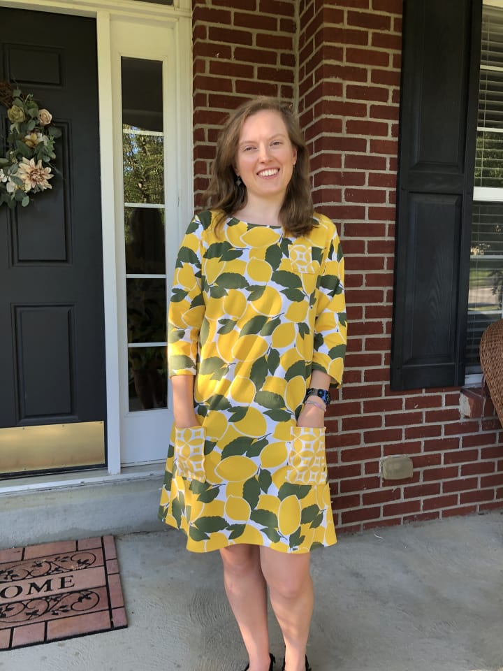 I press the seams. I snip the threads. The moment of truth has arrived. I turn the dress right side out, and the bright yellow lemons burst into view. It fits me like a glove, the smooth fabric sliding over my skin. It’s more comfortable than any dress I’ve ever worn. It has pockets. It’s bright yellow. And I made it with my mother.