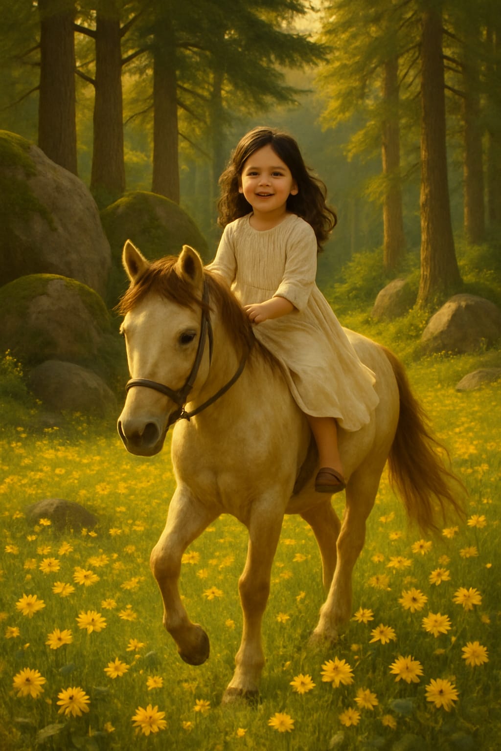 Lina sat tall on the back of her horse, Willow, a cream-colored mare with a mane like spun silk. At just seven years old, Lina looked like a painting come to life — her dark curls bouncing as Willow trotted through a sea of yellow blooms. The sun caught her soft linen dress, casting a halo around her small, radiant frame.