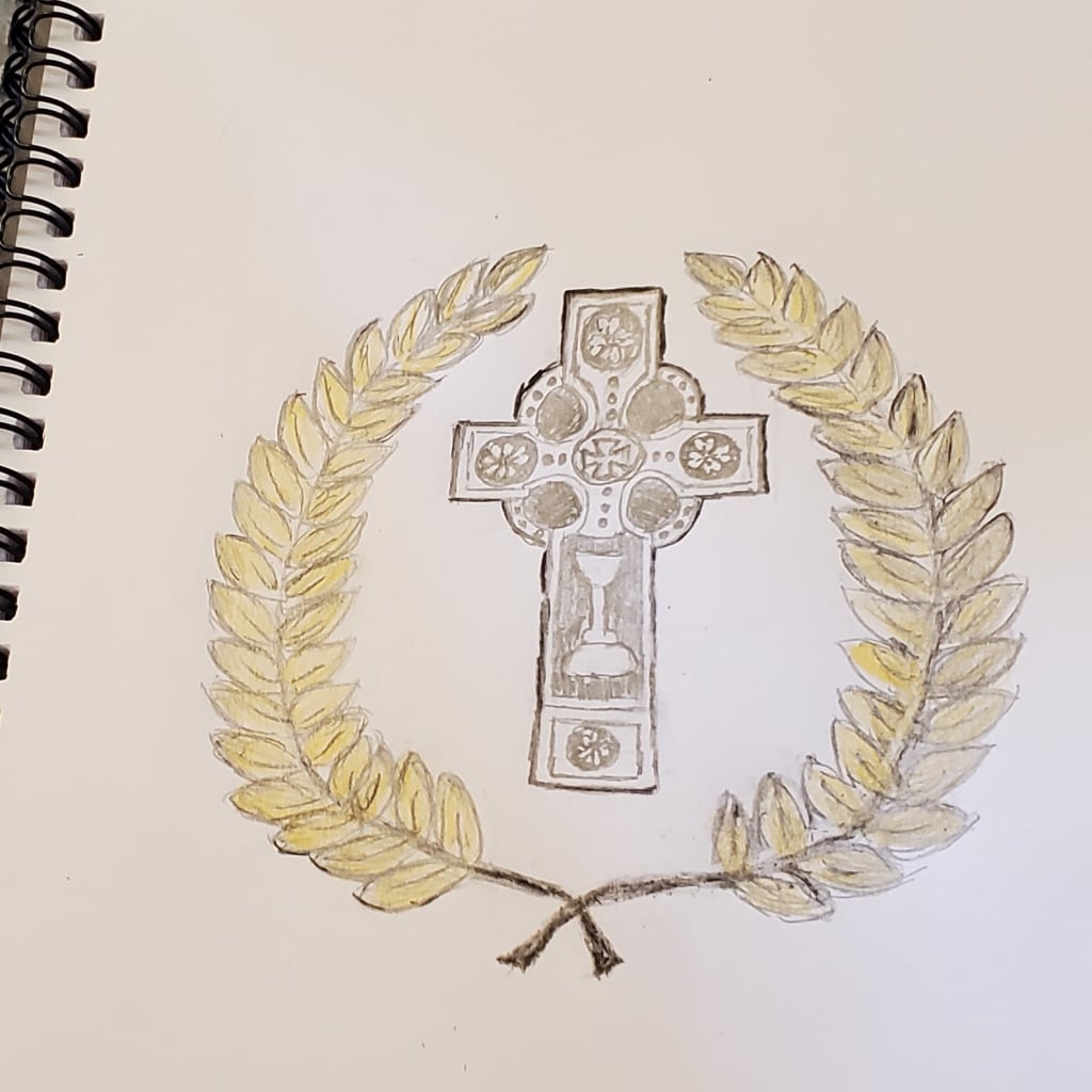 They stared at the pile of gold coins! This strange treasure seemingly came out of nowhere. They quickly dug through the bag looking for clues to identify the owner. No luggage tag or other form of identification was found. The only personal item in the backpack was a small black notebook, which was tucked away in a zippered pocket. No name or title was imprinted on the outer or inner cover. Danielle quickly flipped through the pages looking for a clue. She noticed that at the top of each page she saw an unusual insignia stamped in the top right corner. Perhaps it was a family crest? The design consisted of laurel leaves surrounding a Celtic cross, these symbols might indicate Irish heritage. The notebook appeared to be a log documenting a collection of gold coins. Danielle asked David if he had his phone with him, he reached in his pocket and handed it to her.