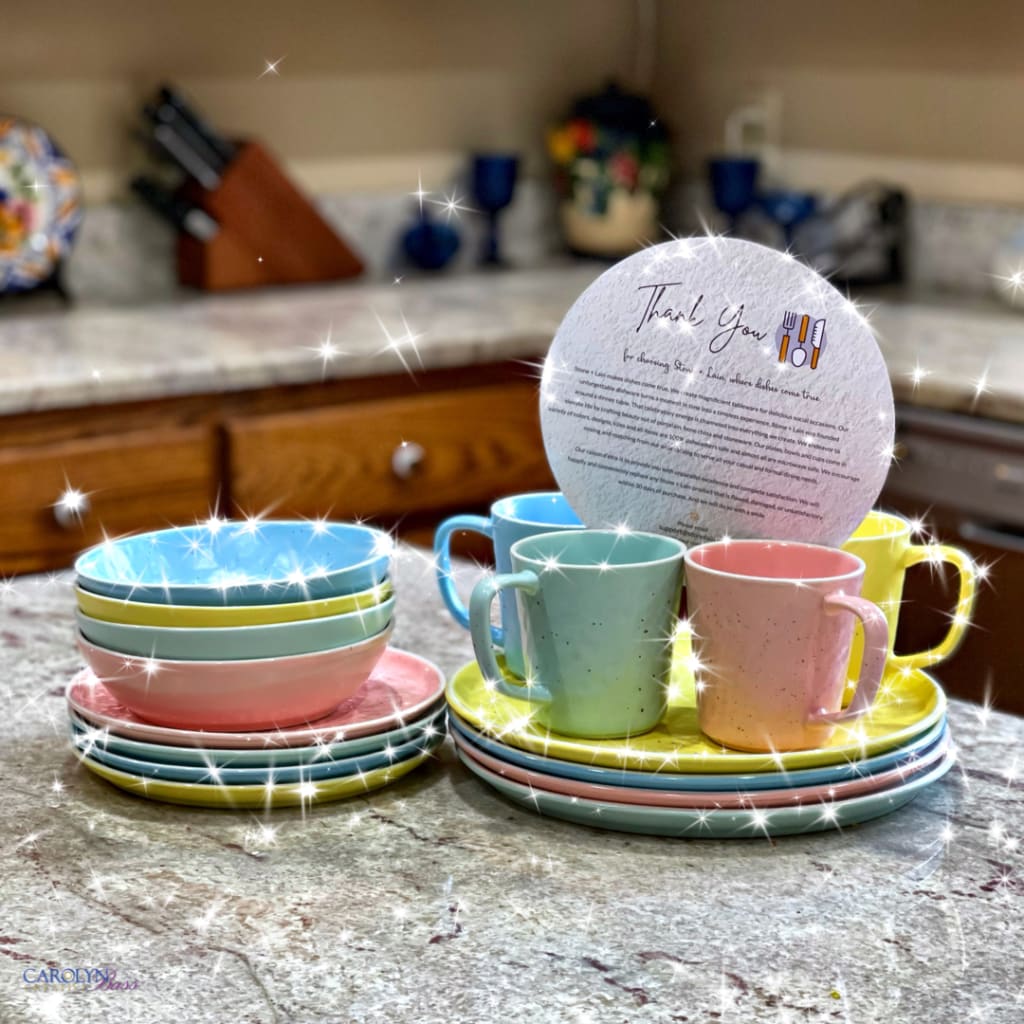 Questions like that aren’t really questions, so I just nodded and unboxed the beautiful blue, mint, pink and yellow dishes, arranging them creatively on the counter.