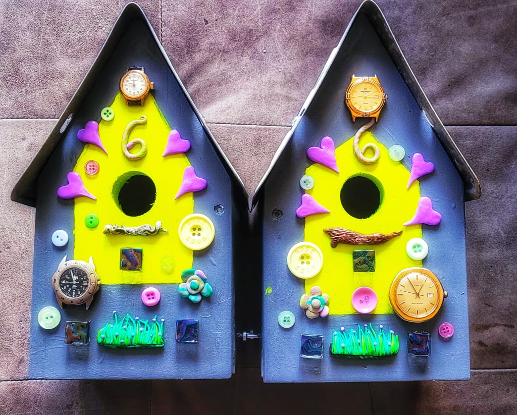 By Friday, the two houses were complete. Because the watch faces were heavier than most of the items I use for decoration, I took extra time and care—and love—to ensure they were secure, and an extra coat of protective seal added another day of production. But they needed to be perfect—my heart and soul comprehended that.