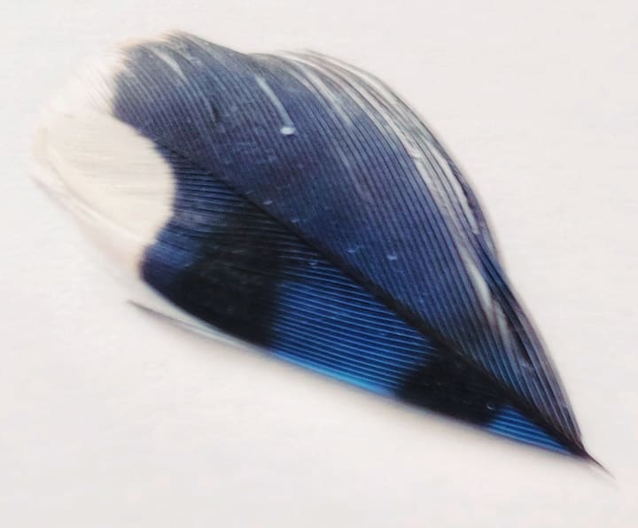 We are fortunate to have many species of birds visit us; it’s common to see cardinals, blue jays, finches of all colors, chickadees, wrens, juncos… we have a forest of trees and several birdhouses for shelter. We find feathers all the time, and when we do, we make a wish for our parents or other beloved friends who have passed away. In six years, I’ve only found brown or white feathers, and I’ve always asked myself, why do we never see blue jay or cardinal feathers?