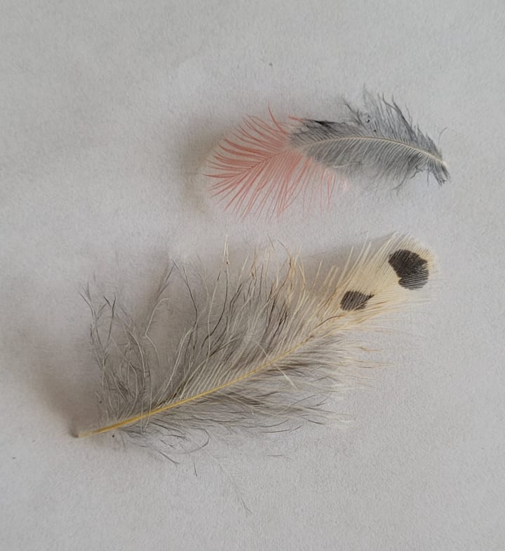 On Wednesday, I walked into our back garden. Part of a nest had fallen to the ground, and I peered closely to find these feathers lying near. I was astonished. I’d never seen anything like them before.
