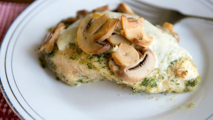 Genius Kitchen's chicken pesto recipe is one of the best dinner recipes with five simple ingredients. To start off our list, this chicken plate only requires a package of pesto sauce mix, boneless skinless chicken breasts, breadcrumbs, provolone cheese, and mushrooms.