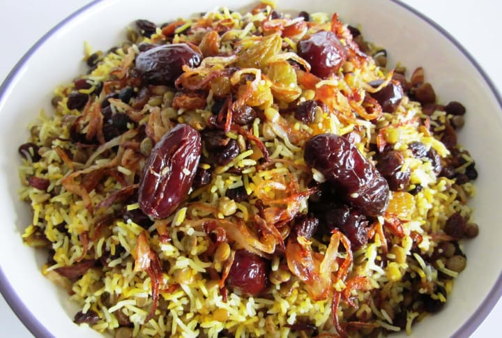 You can make a fried egg and put it on adas polo and serve it. You can separate the kernel of a few dates and sauté the dates in oil or butter and set aside.