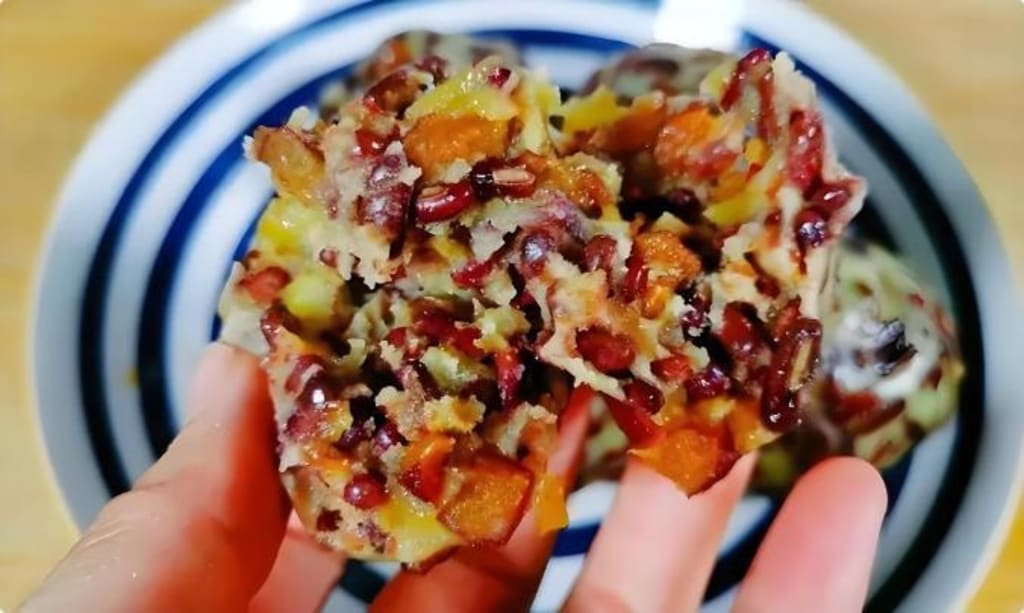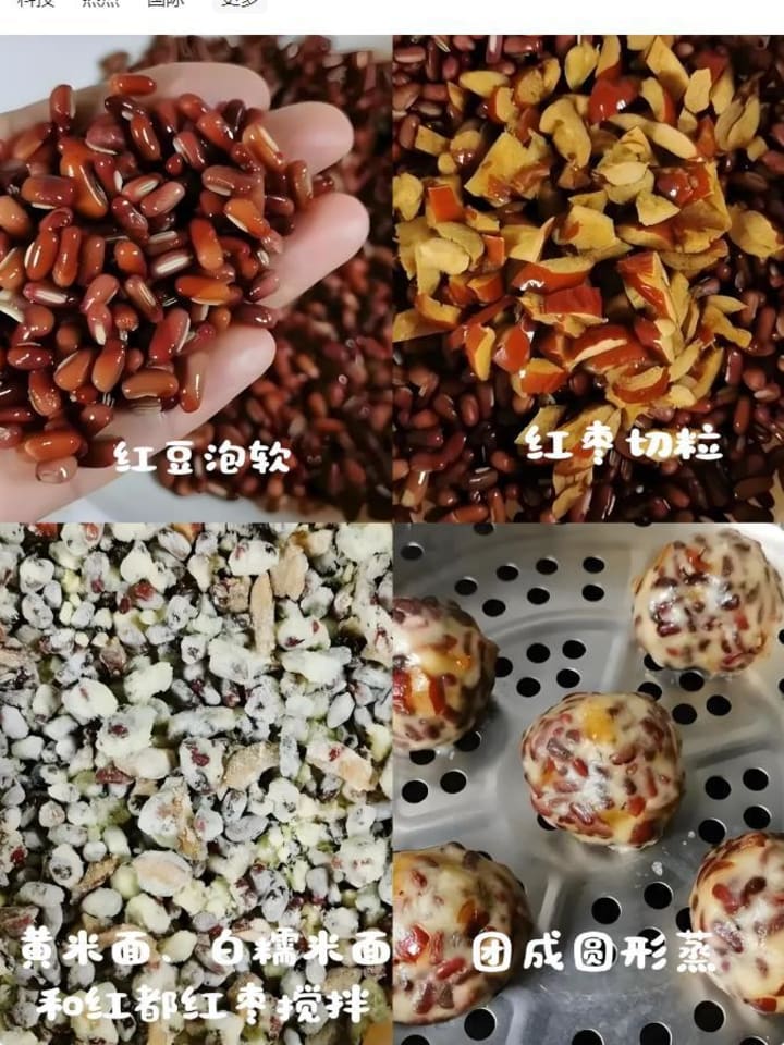 2. Combine glutinous rice flour and millet flour, then mix in the cooked red beans and chopped red dates to form a dough. Let it rest for 10 minutes.