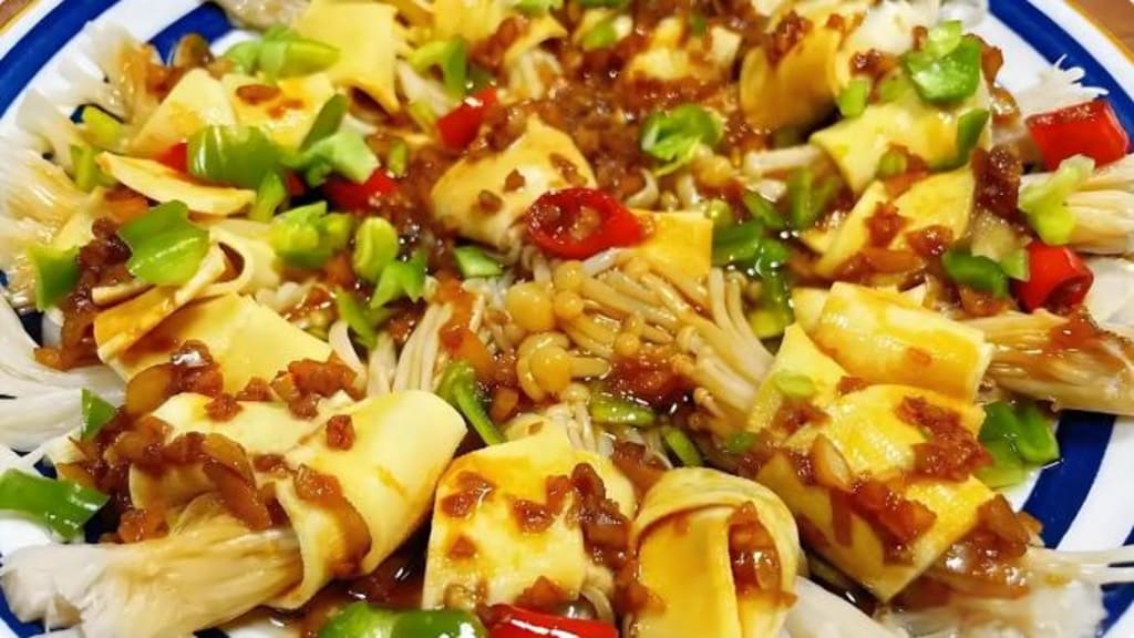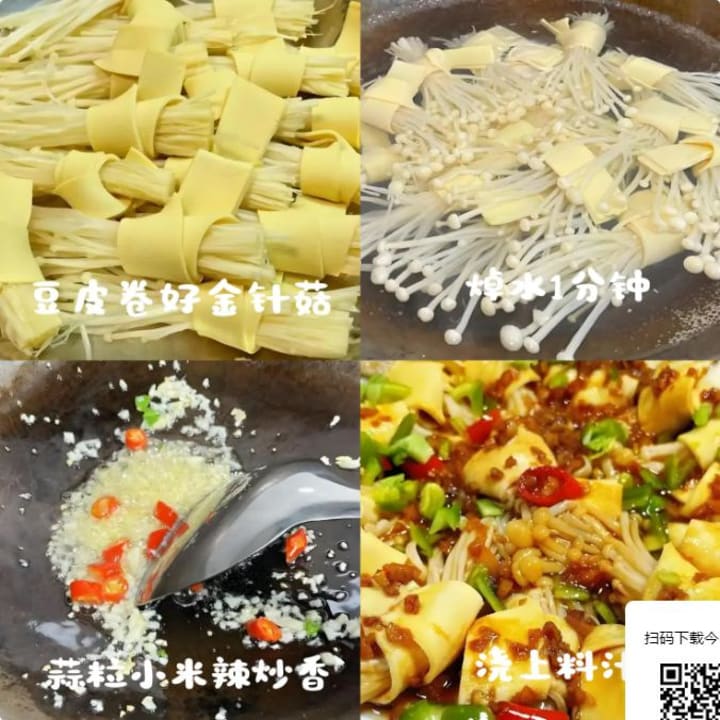 1. Prep: Trim enoki mushrooms and rinse. Soak tofu skin in warm water until pliable (10 mins), then cut into rectangles. Blanch tofu skin and mushrooms separately in boiling water (30 sec for mushrooms), then drain well.
