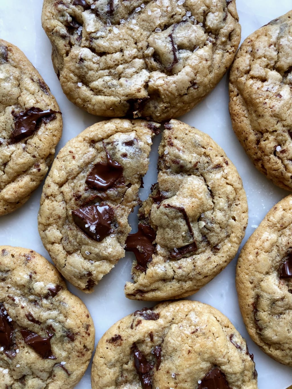 Once you take your cookies out of the oven, DO NOT touch them for at least 5 minutes. Let them sit on the baking sheet, then transfer them to a wire rack to finish cooling. The reason you want to do this is because you've under baked your cookies. As the cookies sit on the baking sheet, they will continue to cook. Have you ever heard of carryover cooking with meat? Same concept. They'll finish cooking on the sheet without the harshness of a 350° oven. Perfectly crunchy on the outside, soft on the inside.
