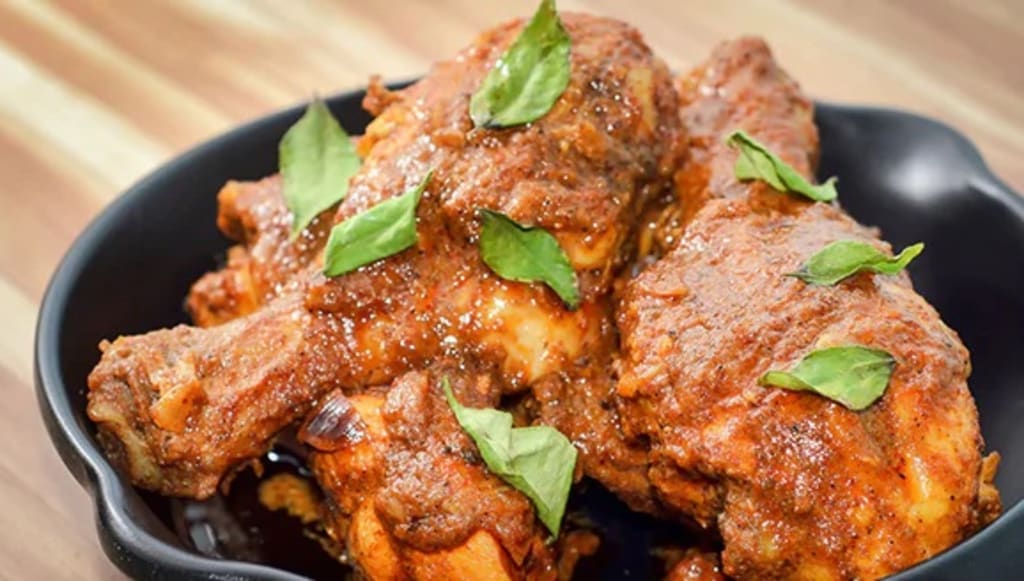 9) Allow the chicken to cook for approximately another 25 minutes, and lower the heat if necessary. Using a probe thermometer, ensure the chicken has cooked to at least 165°F. Once the excess moisture has evaporated, remove the chicken from the heat and set aside. If desired, garnish with slightly seared curry leaves. This dish pairs well with fresh baked naan bread, and feeds approximately 2 people.