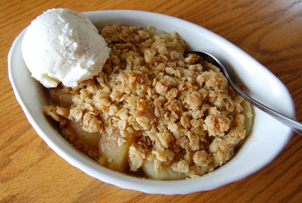 When the cooldown is almost over, you grab a bowl, a spoon, an ice cream scoop, and a container of vanilla ice cream. You grab your spoon and grab a serving of the pear crisp and quickly plop it into your bowl. You then open the ice cream container and, using the ice cream scoop, you scoop a helping of ice cream and set it on top of your serving of crisp. You put away the ice cream and went back to your creation. You take your spoon and you do your best to get an equal amount of crisp and ice cream. You feel the warmth and cold of both foods blend together in your mouth from your first bite. You manage to make a pear crisp that would make your grandmother proud.