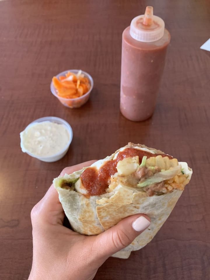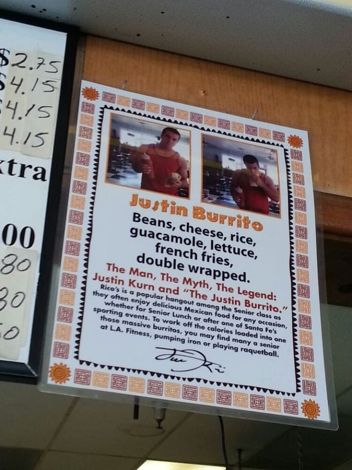 Rico's Taco Shop in Encinitas has one specific item that I make sure I get everytime I go home- and that's the 'Justin Burrito'. Some time ago, there was a high school student named Justin Kurn who is a culinary genius, because he actually crafted the most perfect combination in a burrito. It became so popular and was ordered so frequently, that Rico's decided to just add it to the menu already. Wherever you are now, Justin, thank you. thank you so much for everything you've done. *swoon* The burrito is beans, cheese, rice, lettuce, guacamole, french fries, double wrapped. It may sound like a simple enough combination, but I promise you, it's out of this world. Another nice little touch about Rico's is their salsa bar. It's not just any salsa bar, it's a salsa bar complete with spicy carrots and homemade brownies. Why? Just because Rico's can.