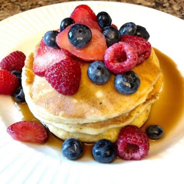 To construct these wonderful pancakes, you have to first mix all the dry ingredients into a large bowl. Second, you will need to add almond milk, vanilla extract, maple syrup, and ACV. Once you do this you will mix all of the ingredients. After this, you will have to let it sit for five to ten minutes. Cook in approximately 1/4 cup scoops over medium heat in a lightly oiled non-stick pan. Flip when bubbles appear in the middle of each pancake, and edges appear dry and cooked. Cook for another three to four minutes on the other side. Wow! We are finished with this extraordinary dish. I hope you enjoy it!