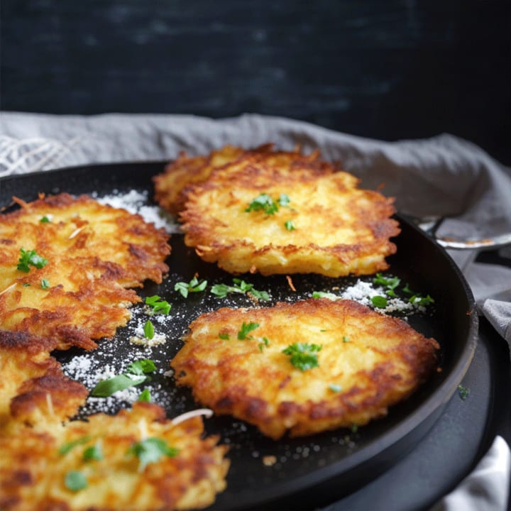 These are crispy pancakes made from grated potatoes mixed with a few basic ingredients, shaped into flat patties, and fried until golden and crispy.