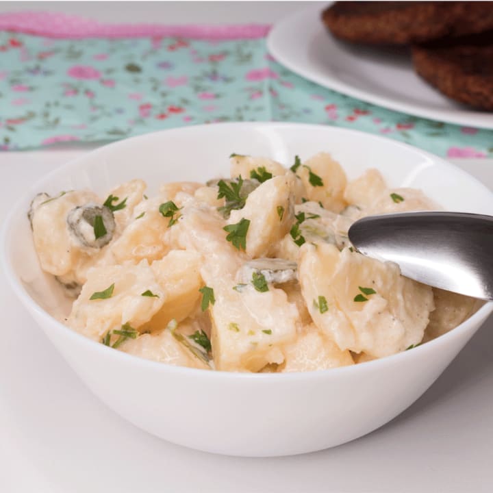 It is made with boiled potatoes, often mixed with a tangy dressing made from mustard, vinegar, and oil.
