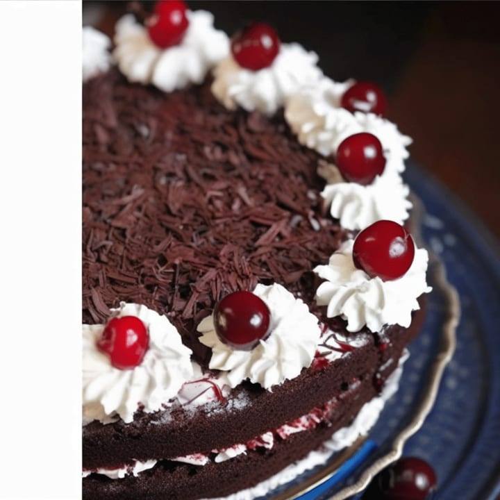 It is made with layers of chocolate sponge cake, whipped cream, and cherries, and finally decorated with chocolate shavings.