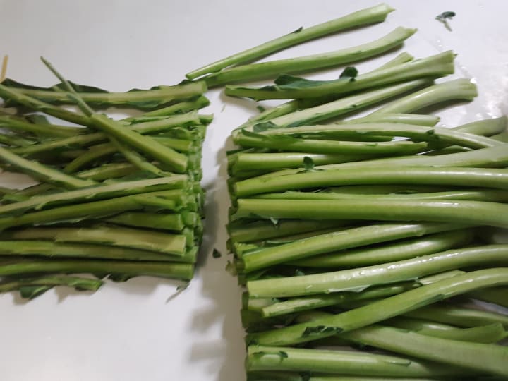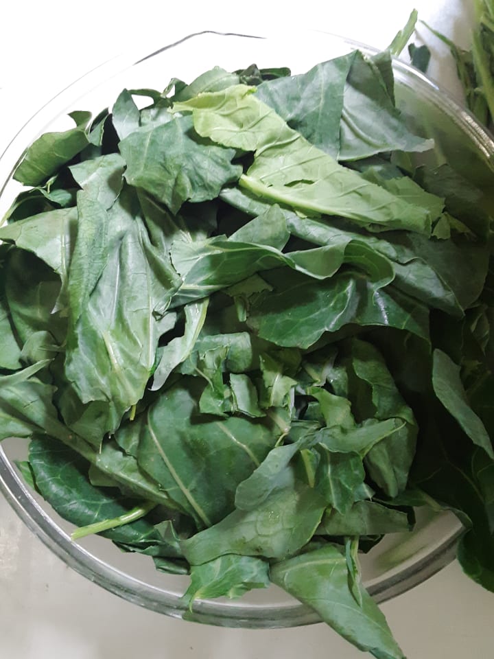 Wait, what? I didn't wash them first? Well, no. I do that later, after I've broken them down a bit and they fit into the sink better. The greens will take over the sink and all the surrounding counter space if I try to wash them first! Once upon a time, I brought home some greens to the refrigerator that I shared in the barracks. My suite mate asked my why there was a ginormous plant in the fridge. Not a Southern woman was she. Anyway, back to the task at hand.
